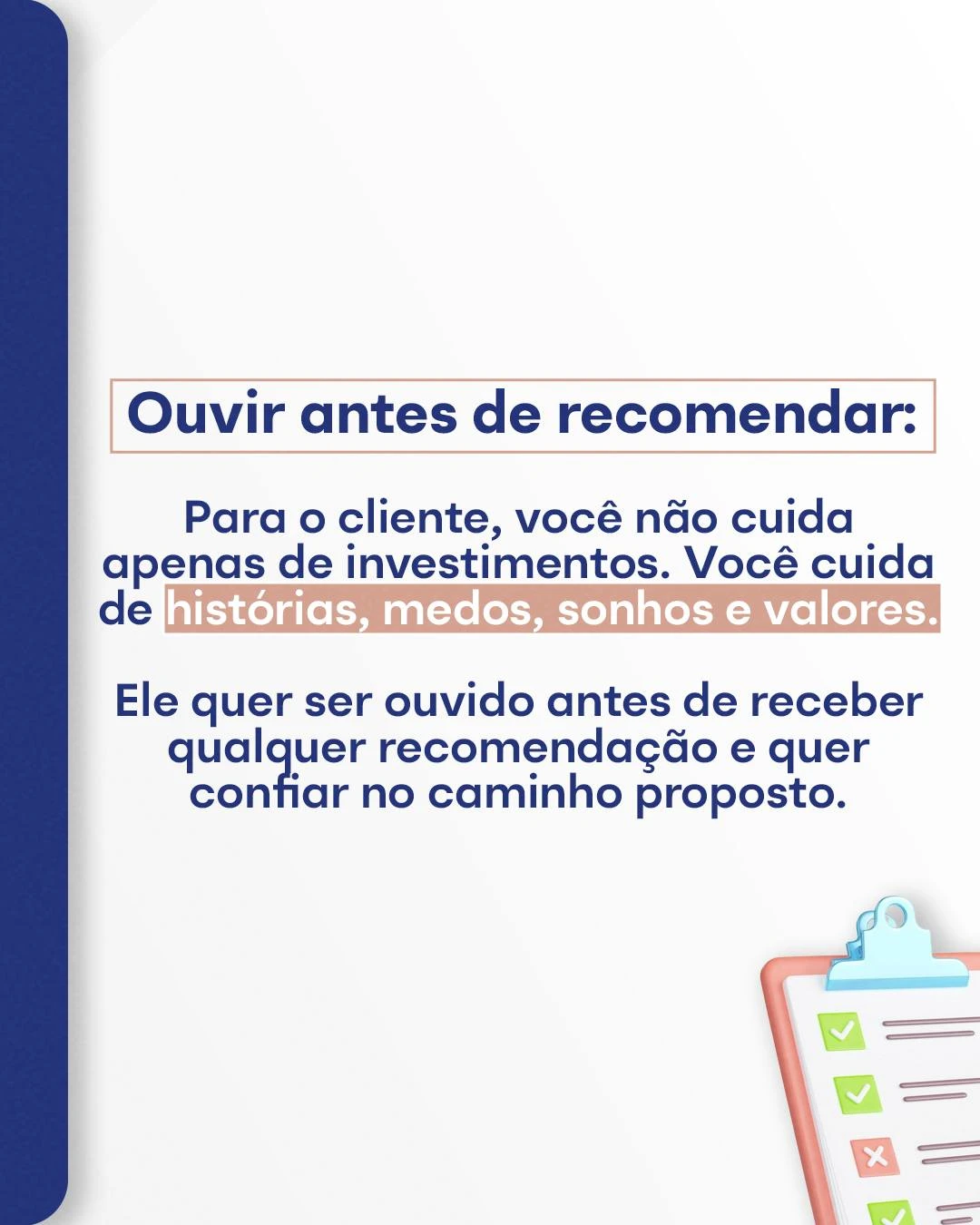 A verdade é que, para a maioria das pessoas, o planejamento financeiro ainda parece um universo repleto de termos complicados, gráficos e números difíceis de interpretar. Só que, no fundo, o cliente está buscando algo muito mais profundo: clareza, direção e segurança para tomar decisões importantes sobre sua vida.